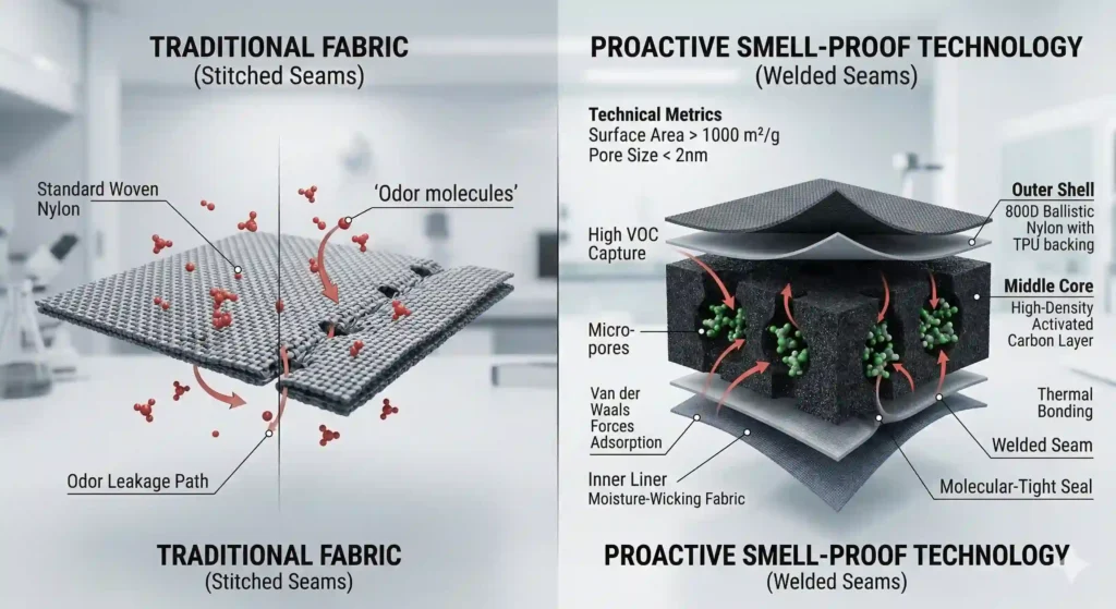We rely on physical adsorption, using Van der Waals forces within an active carbon matrix to literally “pull” odor molecules into microscopic pores. Think of it like a magnet, not a mask. From my experience on the production line, if that carbon layer isn’t top-notch, you aren’t containing odors; youre just delaying the leak. Its about trapping scents at the molecular level, not just stitching in a piece of black cloth and hoping for the best.